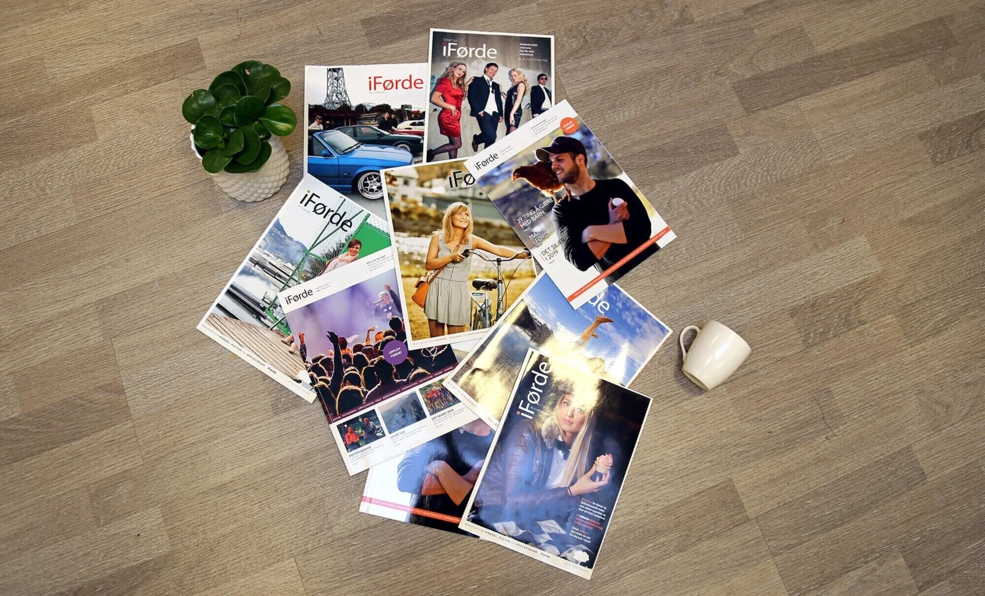 Tidligare utgåver av papirmagasinet iFørde. Foto: Rein Design